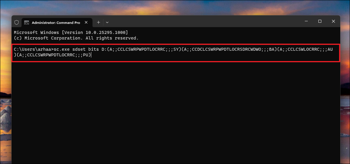 Then, type or copy+paste the following command and execute it. This command will reset BITS and Windows Update services to their default security descriptor. Also, make sure to hit Enter after each command.