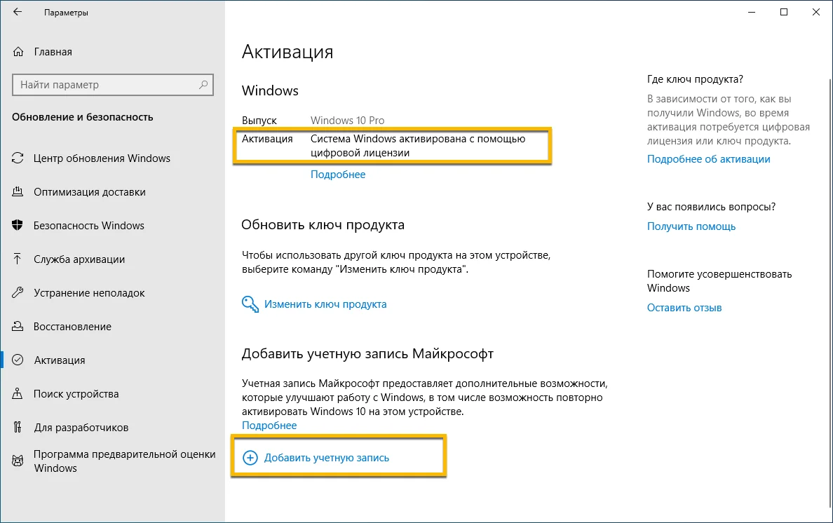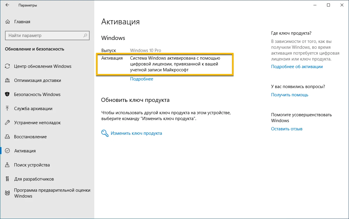 Система Windows активирована с помощью цифровой лицензии, привязанной к вашей учетной записи Майкрософт .
