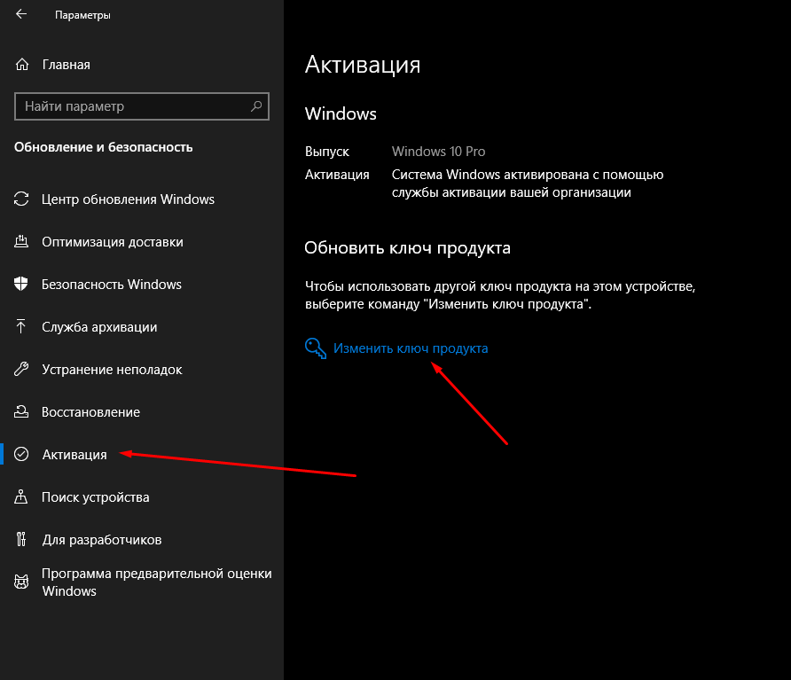 - Затем перейдите в Настройки → Обновление и безопасность → Активация → Изменить ключ продукта.