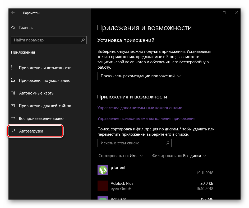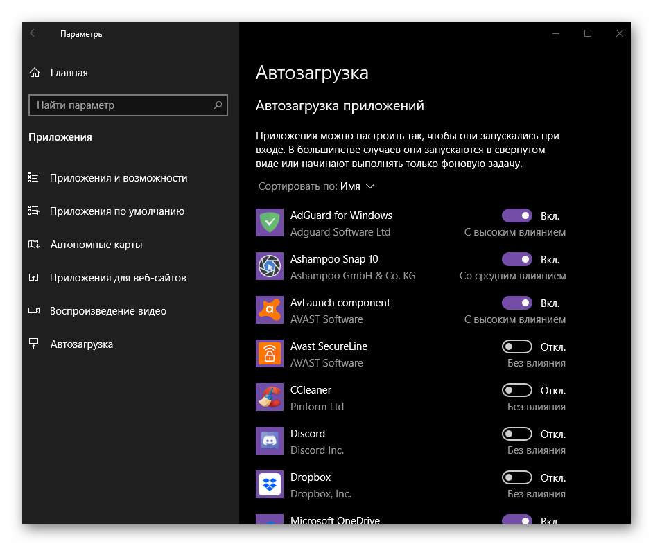 Откройте подраздел Параметры –> Приложения –> Автозагрузка. Ненужные ползунки ставьте на «Отключено». Приложения можно настроить так, чтобы они запускались при входе. В большинстве случаев они запускаются в свёрнутом виде (в фоне).