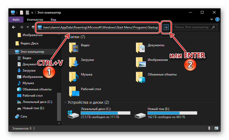 - Открыть папку «Автозагрузка» по одному из путей, указанных выше.