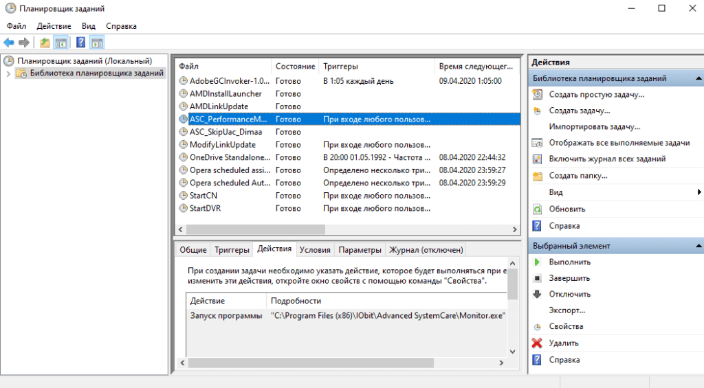 В поиске введите «Планировщик заданий» и выберите «Запуск от имени администратора». Например, в списке нашёл задание Advanced SystemCore, которое хочу отключить. Во вкладке «Триггеры» стоит «При входе в систему» и на вкладке «Действие» — «Запуск программы Monitor.exe». В меню выбираем пункт «Завершить», а потом «Отключить».