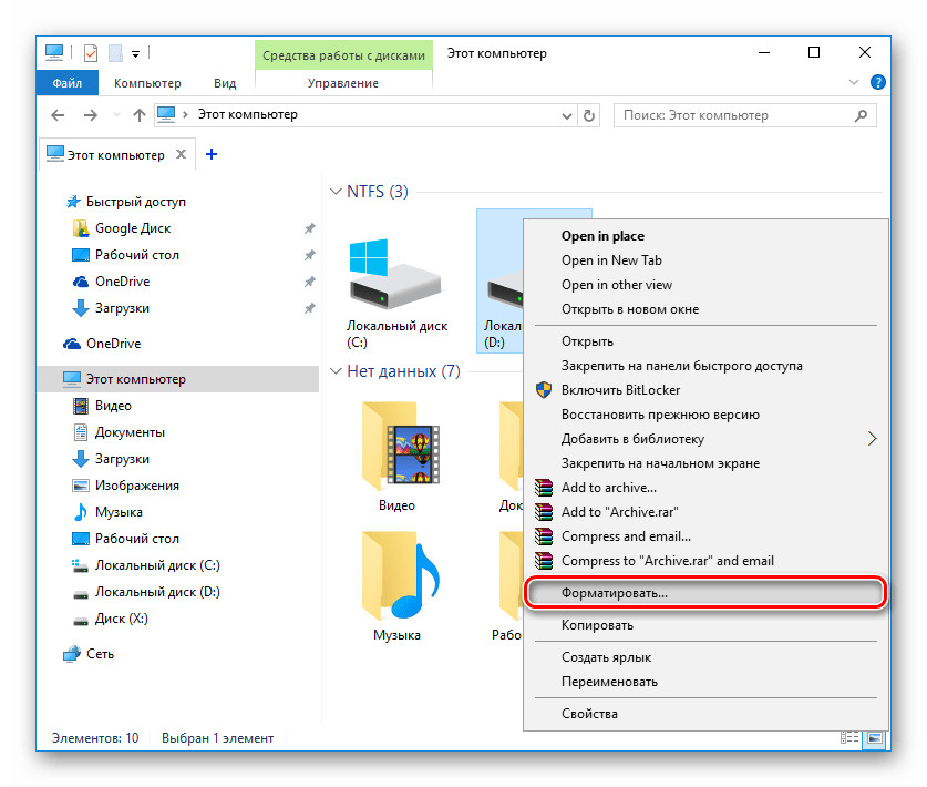 - Форматирование средствами проводника (правый клик по диску в проводнике — пункт контекстного меню «Форматировать»).