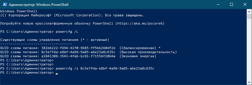 Итак, в Windows 10 последних версий дефолтные схемы электропитания выглядят следующим списком: