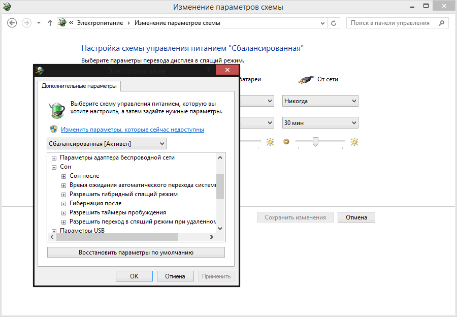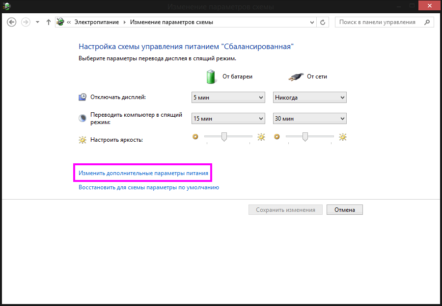 Чтобы изменить настройки существующего плана, откройте Панель управления -> Электропитание. Напротив активного плана (выделен радиокнопкой) нажмите Настройка плана электропитания -> Изменить дополнительные параметры питания.