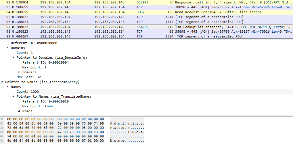 С помощью RPC реализуются и другие техники, например Account Discovery. Отправка запросов сервису Security Accounts Manager по протоколу SAMR позволяет получить список учётных записей и групп в домене, а перебор идентификаторов SID с помощью службы Local Security Authority (LSARPC) позволяет узнать имена пользователей на удалённом узле.