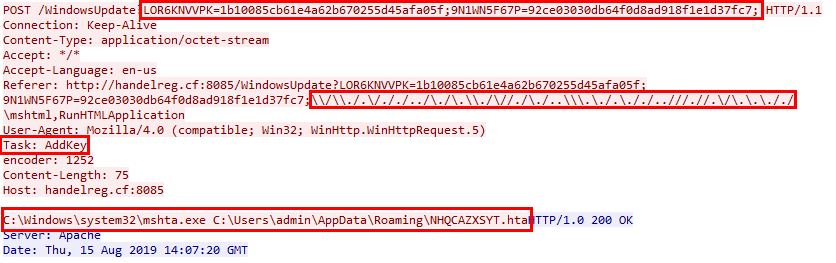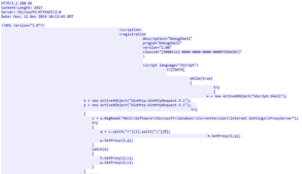 Ниже представлен ответ агента Koadic командному серверу. Часть служебной информации, например тип исполненного задания, создатели хранят в собственных HTTP-заголовках. Идентификаторы сессии и задачи устанавливаются случайным образом, а путь к библиотеке mshtml обфусцирован для обхода сигнатур IDS, но вид URI всё равно является одним из индикаторов, по которому можно узнать Koadic.