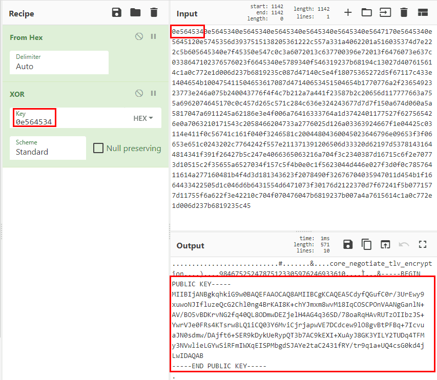 Другим примером детектирования служит обнаружение Meterpreter Reverse TCP Shell. В начале соединения происходит отправка пакета определённой длины, внутри которого передаётся публичный ключ RSA-2048. Такой пакет дополнительно защищён шифром гаммирования (XOR), однако из-за малой длины гаммы в структуре пакета можно выявить повторяющиеся части. На рисунке ниже выделены такие фрагменты, а также сам зашифрованный ключ.