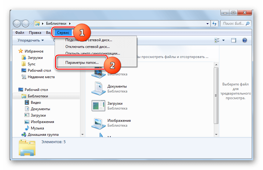 - Откройте проводник Windows. В активном окне проводника, нажмите “Alt”. В верхнем меню раскройте пункт “Сервис” и выберите строчку “Параметры папок”