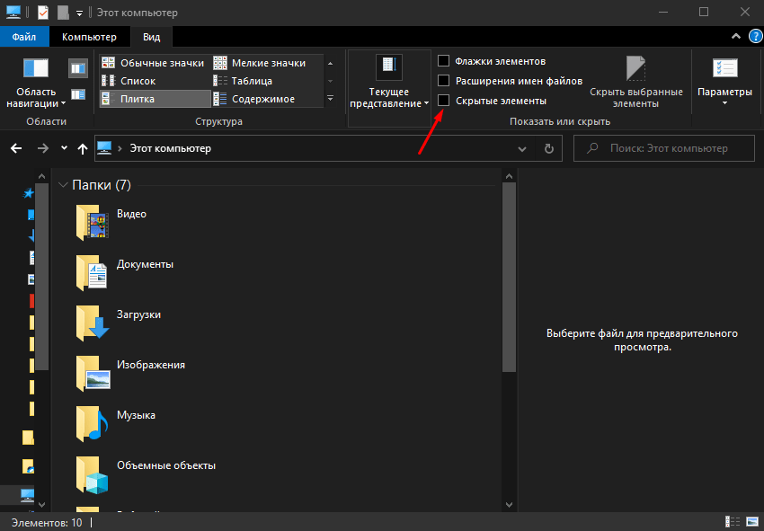Без предварительной настройки, так сказать невооруженным глазом, такой файл не увидеть. Для этого придется заходить в параметры «Проводника» и включить отображение скрытых/системных файлов. В Windows 10 это сделать просто – нужно лишь открыть приложение, перейти ко вкладке «Вид» и поставить галочку напротив пункта «Скрытые элементы».
