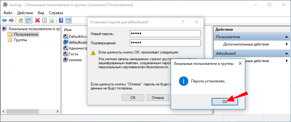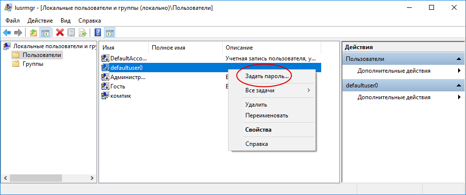 2. В окне lusrmgmr, нажмите на папку Пользователи и кликните правой кнопкой мыши на записи defaultuser0, выбрав в контекстном меню опцию – Задать пароль.