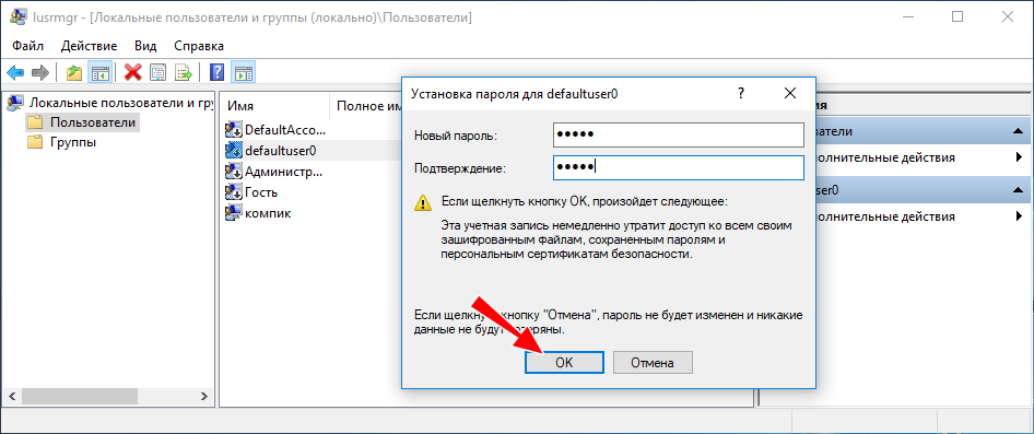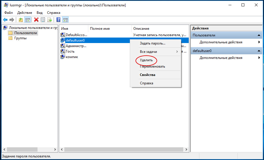 Находясь в своей учетной записи администратора, откройте командой lusrmgr.msc оснастку управления пользователями, зайдите в раздел «Пользователи» и удалите учетную запись defaultuser0.