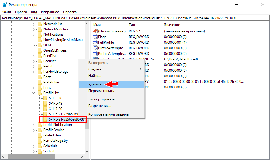 Папку в которой найдется defaultuser0 нужно удалить. Кликните правой кнопкой мыши на ней и выберите Удалить. Закройте редактор реестра. Перезагрузитесь в нормальный режим работы.