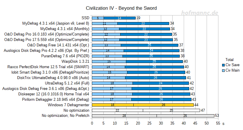 Время запуска игры Civilization IV – Beyond the Sword уменьшилось в среднем на 14 секунд или на 26 %. Самым эффективным дефрагментатором является MyDefrag 4.3.1.