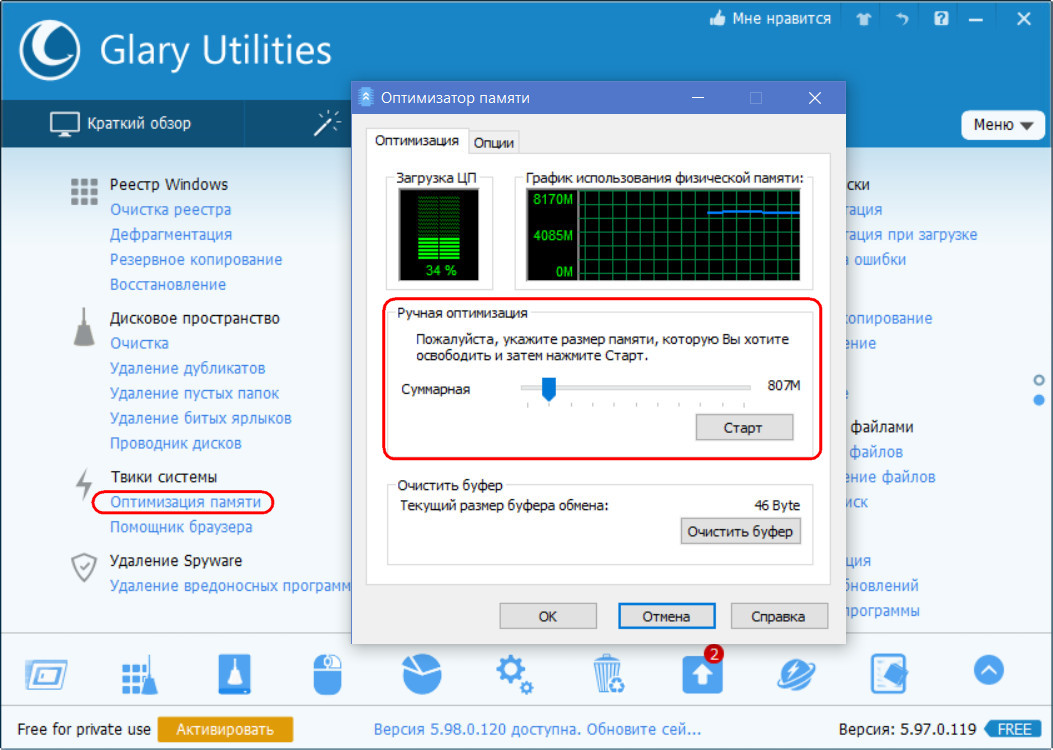 По последнему принципу работает, например, утилита-оптимизатор в составе комплексного продукта по чистке и оптимизации Windows — Glary Utilities. Мы указываем ей, сколько хотим высвободить оперативной памяти в рамках доступного максимального объёма. И утилита выполняет наш заказ.