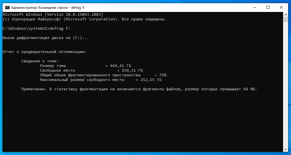 В открывшейся командной строке введите «defrag f:» (без кавычек, f – раздел вашего диска, которому требуется оптимизация), если хотите выполнить дефрагментацию локального диска F: