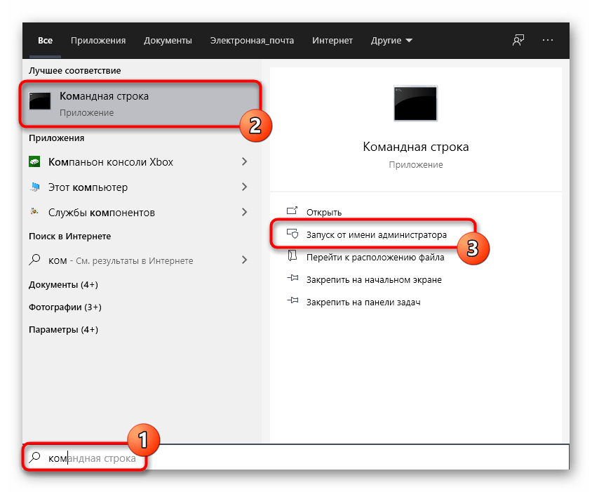 - Откройте «Пуск» и запустите «Командную строку» от имени администратора, отыскав ее приложение через поиск. Это же можно сделать и любым другим удобным способом, но главное — запуск от привилегированного пользователя.