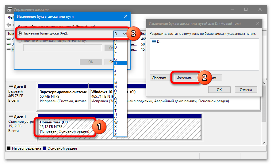 Ещё одна вероятная причина проблемы связана с конфликтом адресов, возникающим тогда, когда система назначает флешке уже занятый символ (или не назначает никакой). В «Управлении дисками» такая флешка отображается, её файловая система носит нужный формат и помечена как «Исправен». Всё что нужно сделать – раскрыть меню, нажать на «Изменить букву диска…», кликнуть на «Изменить» и задать любую другую букву.