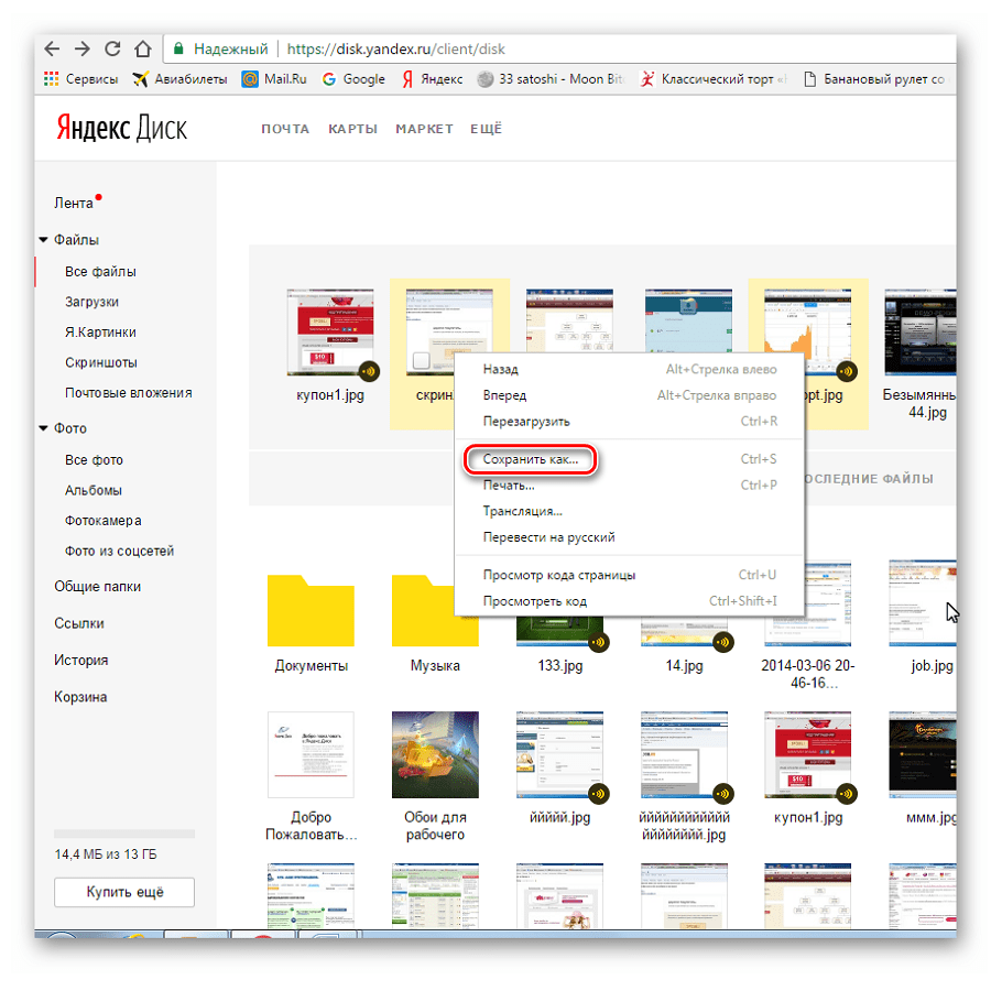 Чтобы скачать информацию с Яндекс Диска, выберете интересующий вас файл, нажмите по нему правой кнопкой мыши и нажмите «Сохранить как». В появившемся меню укажите место в компьютере для сохранения.