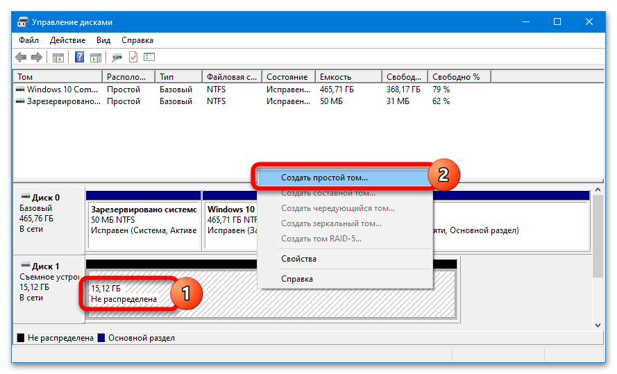 Посмотрите на состояние носителя. Если пространство выделено чёрным и помечено как «Не распределена», раскройте меню и кликните на «Создать простой том». Выполняйте указания помощника, чтобы сформировать рабочий раздел и отформатировать флешку.