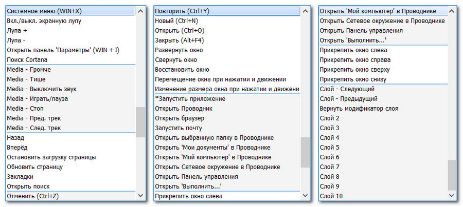 В каждом списке можно установить комбинации нажатий на кнопки клавиатуры, которые будут запускать определённые действия утилиты – в первую очередь, переключение на нужный слой.