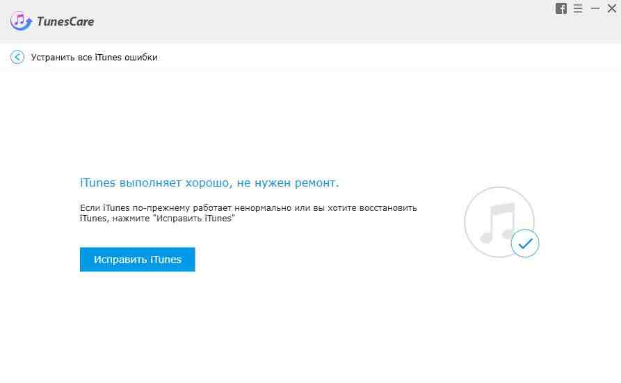 3. Программа автоматически проанализирует работу айтюнс и скажет, необходим ли ей «ремонт». Если утилита определяет, что медиакомбайн работает нормально, а ваша проблема по-прежнему не решена, нажмите на кнопку «Исправить iTunes».