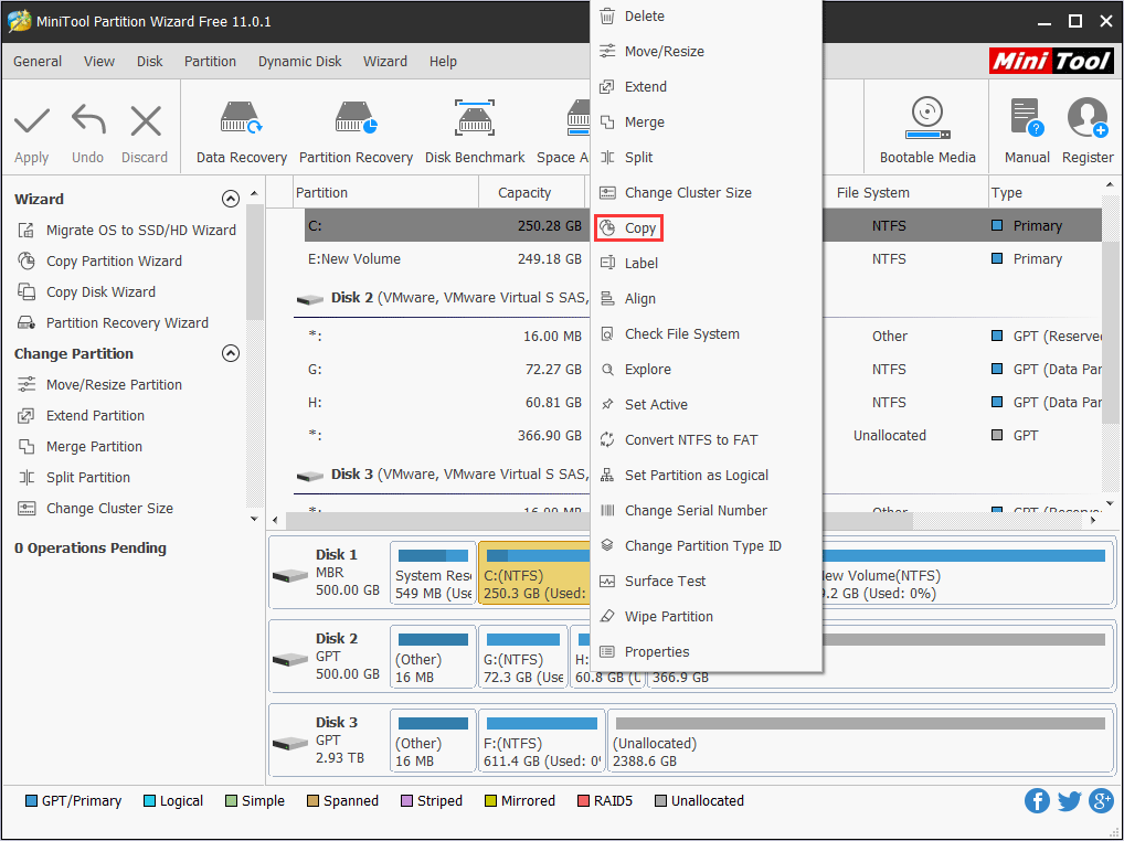 Step 1: Activate Copy Partition feature of MiniTool Partition Wizard.