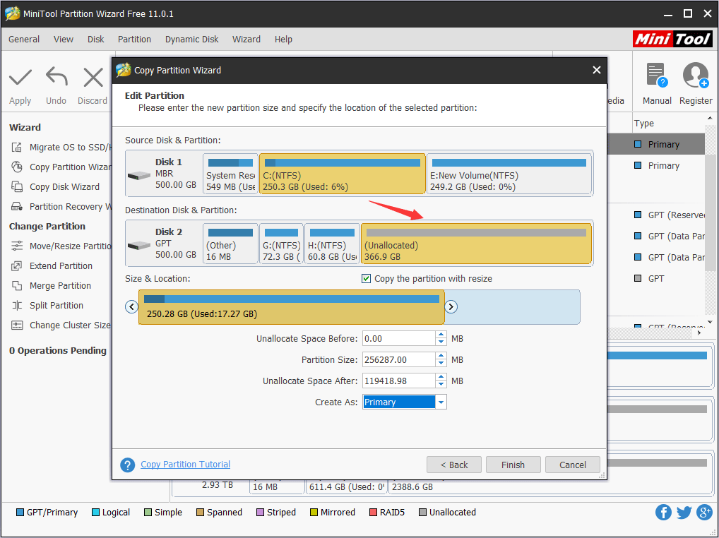 - Copying the partition with resize option allows you to adjust the size of new partition by dragging the arrow icons.