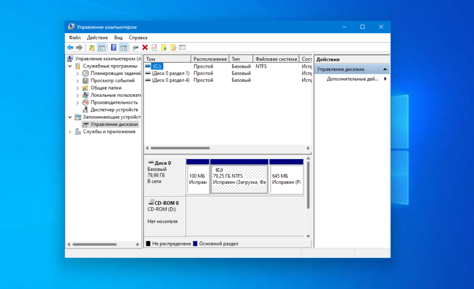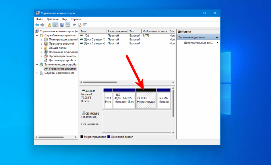 Здесь внизу окна мы видим список дисков и системный диск C на диске 0. Если у вас есть ещё дополнительный диск для файлов то он будет иметь метку D или E. Дальше я приведу пример как отделить дисковое пространство от диска C. Для других дисков всё аналогично.