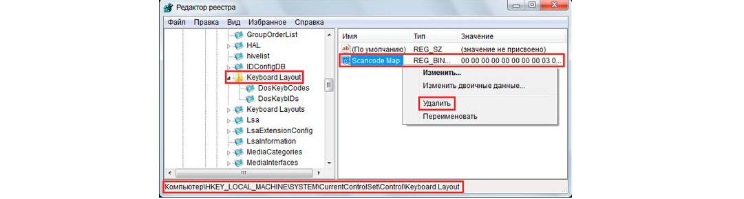 Отключение и переназначение происходит изменением системного реестра, что сложно назвать безопасным действием. На вкладке «Выполнить» (Win+R) вводится команда «regedit». Затем необходимо перейти на раздел: Компьютер\HKEY_LOCAL_MACHINE\SYSTEM\CurrentControlSet\Control\KeyboardLayout.