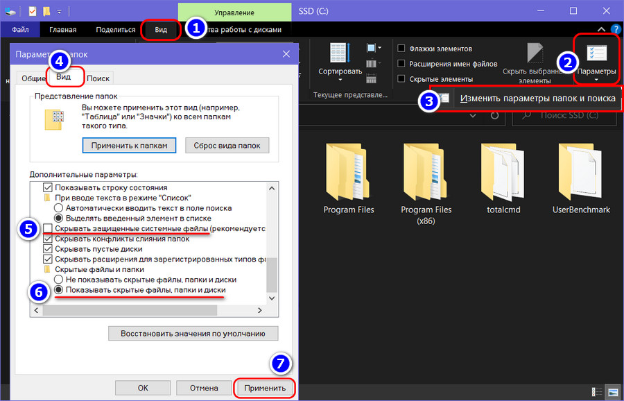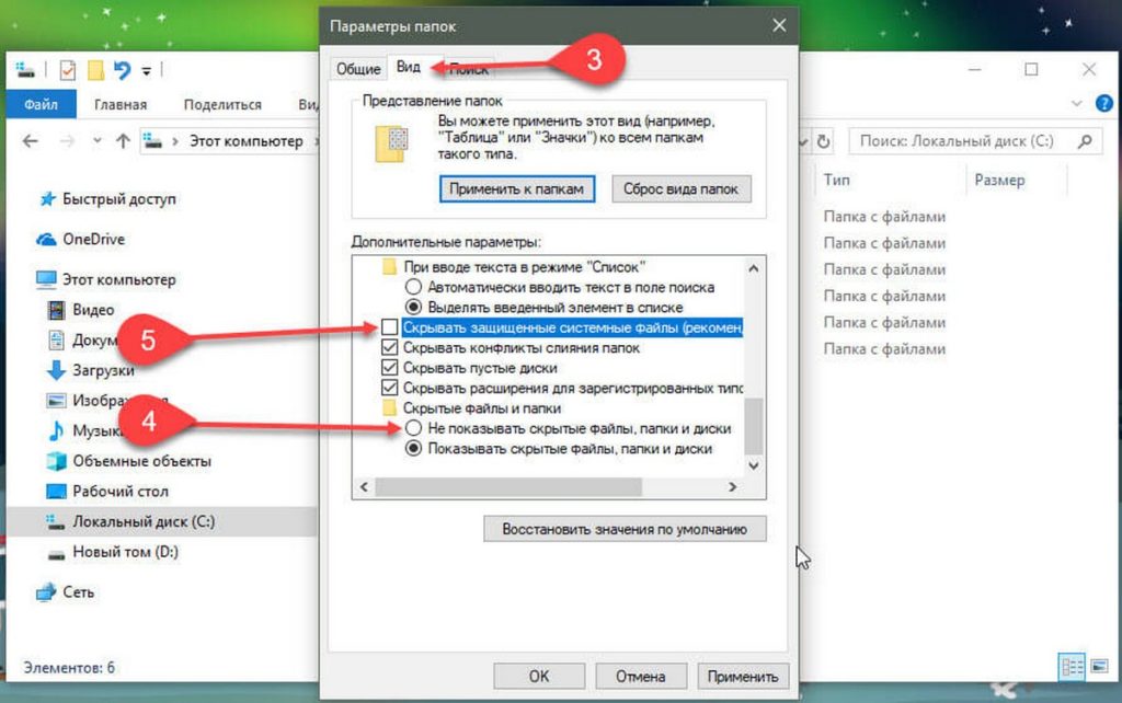 - Затем снимаем галочку напротив пункта “Скрывать защищенные системные файлы”, и активируем параметр “Показывать скрытые файлы”.