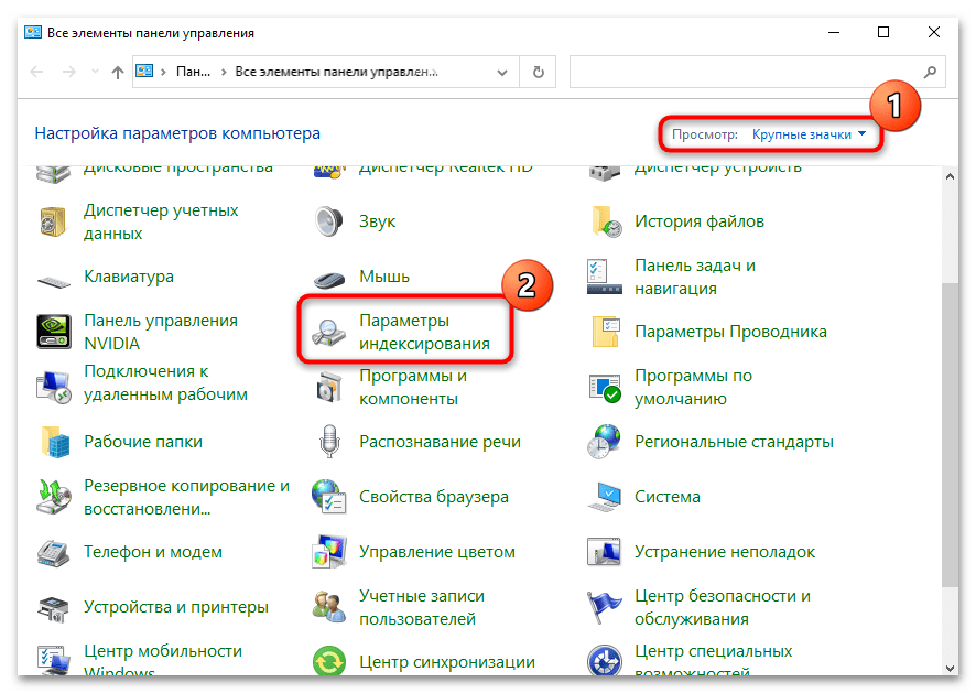 Для этого, сначала необходимо открыть панель управления Windows, перевести отображения в крупные значки и открыть параметры индексирования. См. скриншот ниже.