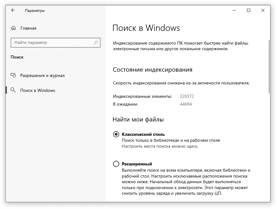 В Windows 10 предусмотрено 2 режима поиска: классический и расширенный. При классическом режиме поиск осуществляется только в библиотеках пользователя и на рабочем столе. Расширенный режим позволяет искать файлы по всему компьютеру, за исключением системных папок. Расширенный режим, как предупреждает операционная система, может снизить уровень заряда и увеличить нагрузку на центральный процессор