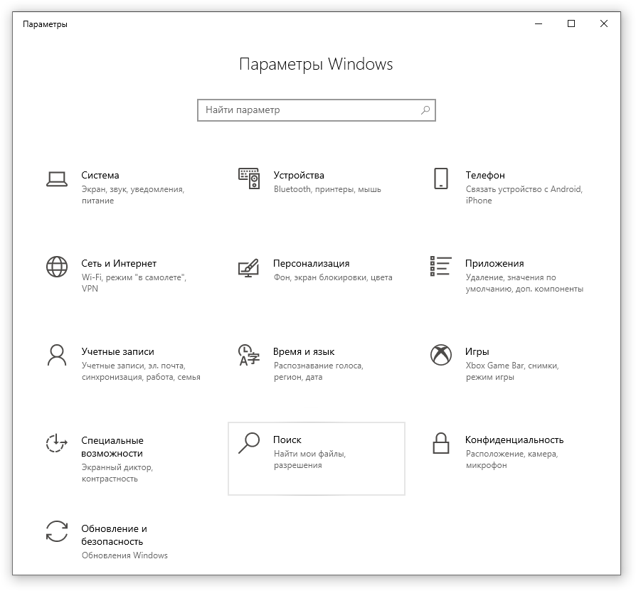 Раздел «Поиск» находится практически в самом низу Параметров Windows.