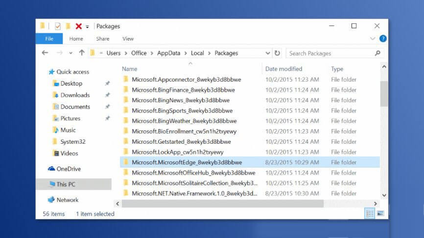 - Здесь поиск Microsoft.MicrosoftEdge_8wekyb3d8bbwe папку и удалите ее.