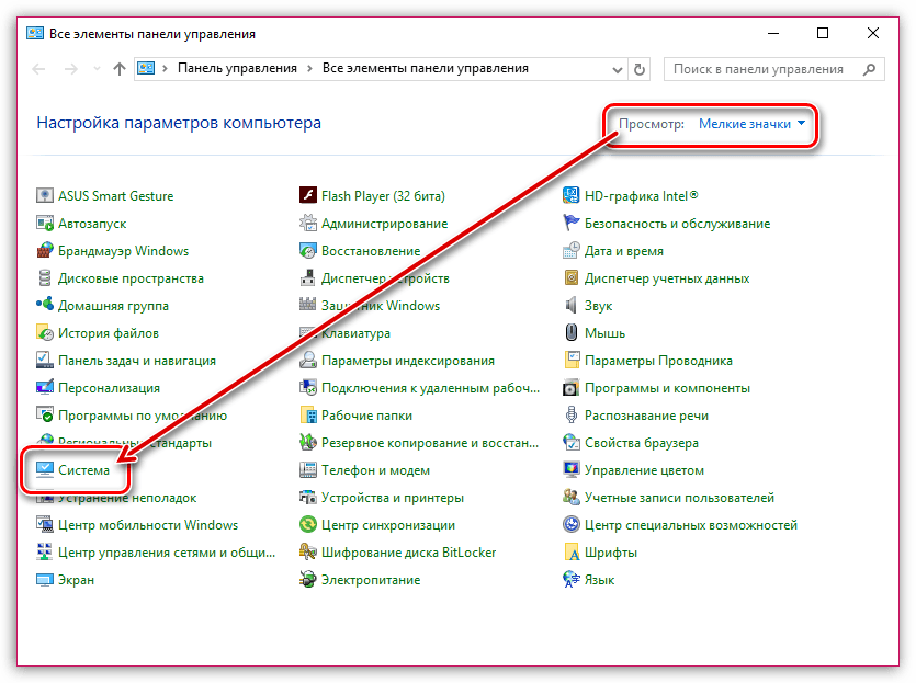 Если вы не знаете разрядность своего компьютера, откройте меню «Панель управления», выставьте режим просмотра «Мелкие значки» и откройте раздел «Система».