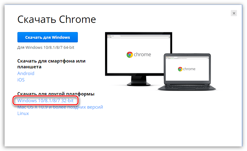 Обратите внимание, если она отличается от разрядности вашего компьютера, еще чуть ниже щелкните по кнопке «Скачать Chrome для другой платформы»