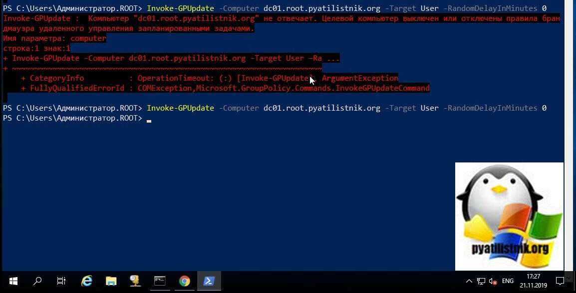 Invoke-GPUpdate : Компьютер «dc01.root.pyatilistnik.org» не отвечает. Целевой компьютер выключен или отключены правила брандмауэра удаленного управления запланированными задачами (Invoke-GPUpdate : Computer «dc01.root.pyatilistnik.org» is not responding. The target computer is either turned off or Remote Scheduled Tasks Management Firewall rules are disabled.). Имя параметра: computer строка:1 знак:1 + Invoke-GPUpdate -Computer dc01.root.pyatilistnik.org -Target User –Ra … + ~~~~~~~~~~~~~~~~~~~~~~~~~~~~~~~~~~~~~~~~~~~~~~~~~~ + CategoryInfo : OperationTimeout: (:) , ArgumentException + FullyQualifiedErrorId : COMException,Microsoft.GroupPolicy.Commands .InvokeGPUpdateCommand