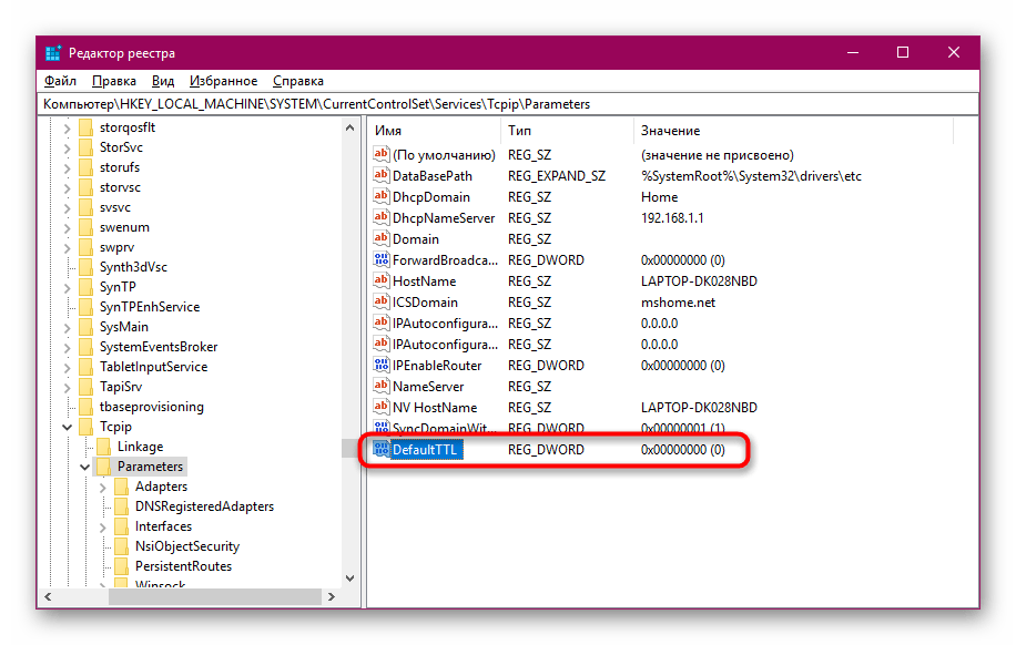- Теперь у вас должен появиться параметр DefaultTTL со значением 0x00000041 (65). Перезагружаем компьютер для применения конфигурации.