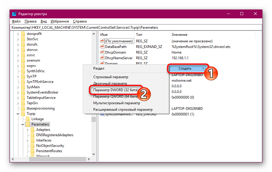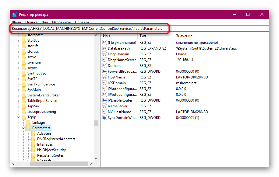 - В реестре идем по адресу: HKEY_LOCAL_MACHINE\SYSTEM\CurrentControlSet\Services\Tcpip\Parameters