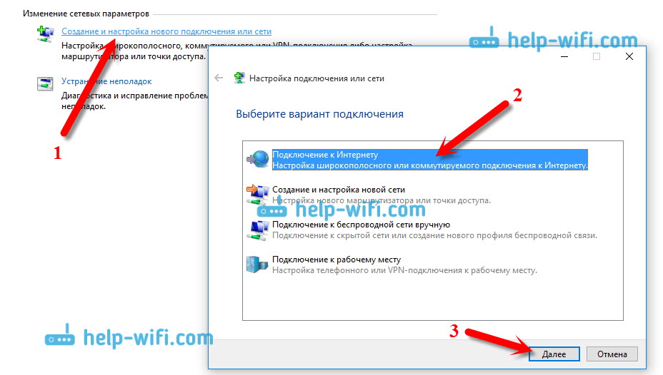 - Указать раздел «Подключение к Интернету», кликнуть «Далее»;