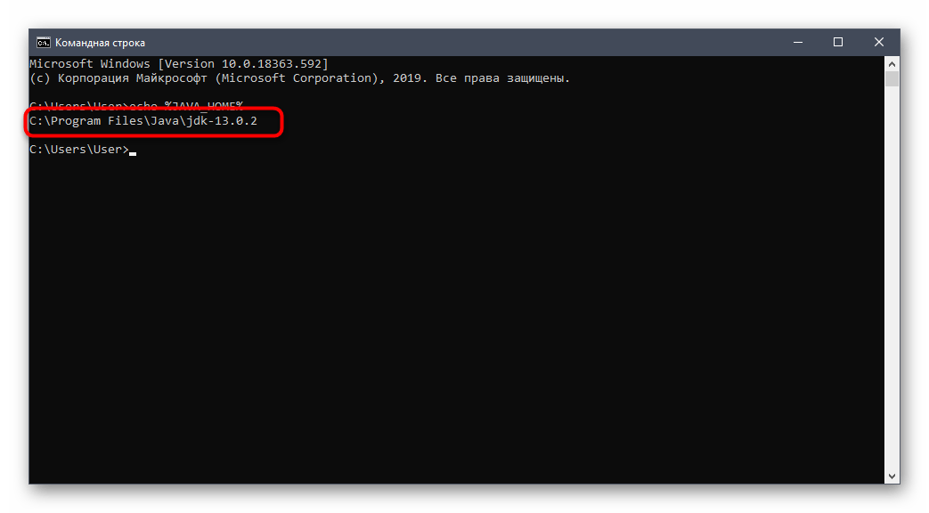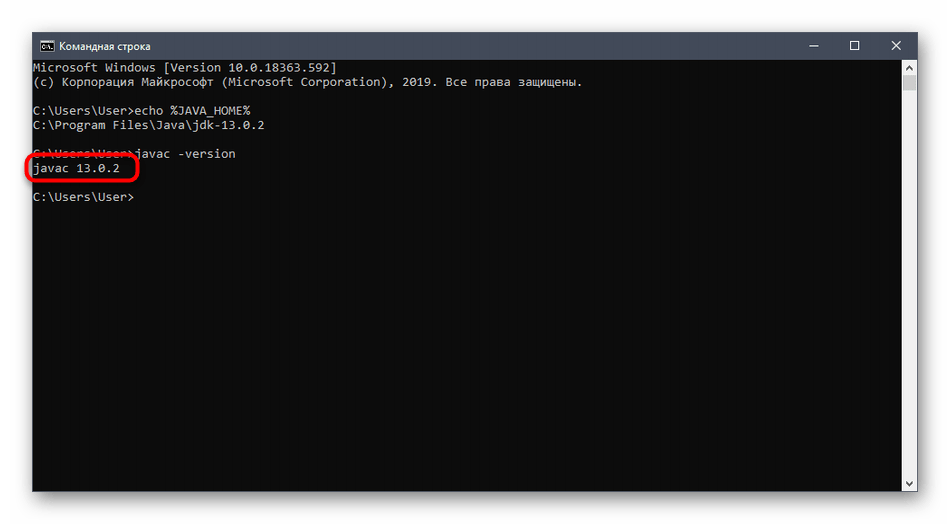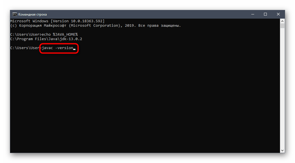 Завершающий этап сегодняшнего материала заключается в проверке работоспособности Java Development Kit, что иногда требуется сделать для подтверждения корректной обработки запросов компилятором и успешной интеграции библиотек. Осуществляется эта задача через стандартную консоль путем ввода всего двух команд.