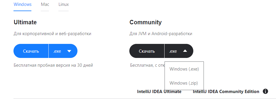 IntelliJ IDEA доступна в бесплатной (Community) и платной (Ultimate) версиях. Чем они различаются, видно на скрине ниже: