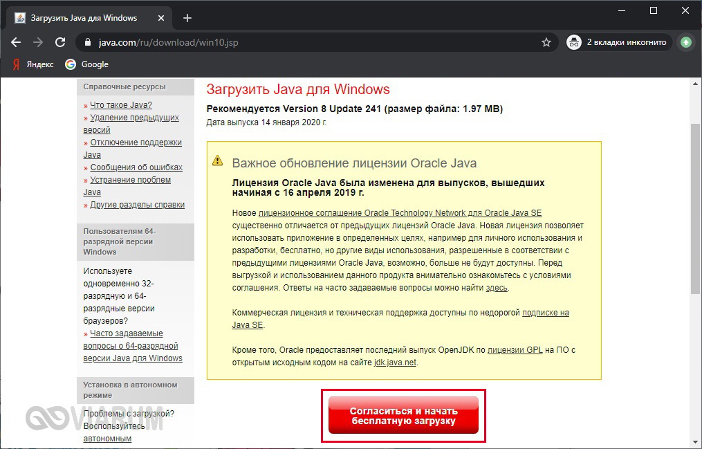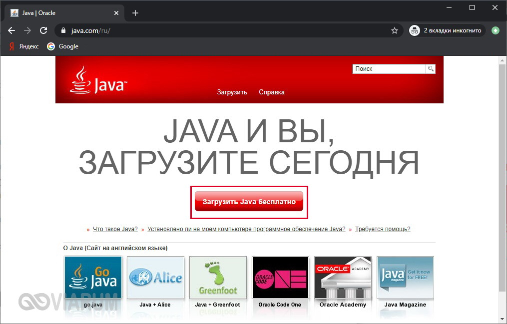 Если по какой-то причине вы не смогли найти панель Java на своем компьютере, или она не запустилась, скачайте и установите актуальную версию библиотеки с официального сайта Java. Для этого перейдите в браузере по адресу https://www.java.com/ru/, а потом нажмите кнопку .