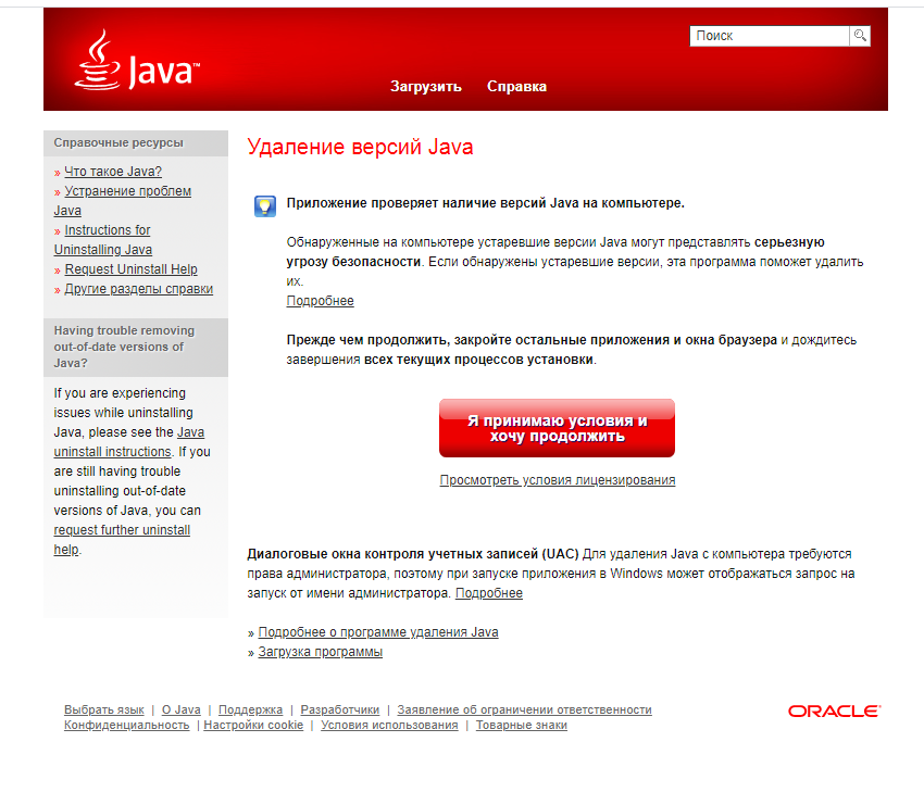 Чтобы выполнить update в Джава, иногда надо удалить старые версии программы (отдельные модули) и выполнить установку новых. Сделать это можно на сайте разработчиков. Существует специальная страница с инструментом, позволяющим избавиться от старых out of date версий, чтобы потом установить новые версии Java. Для работы просто нажмите кнопку, указанную на сайте. В результате можно будет загрузить исполняемый файл . Программа проверит, есть ли на вашем компьютере версии Java, которые можно деинсталлировать. Далее вы спокойно производите установку актуальной версии, указав куда.