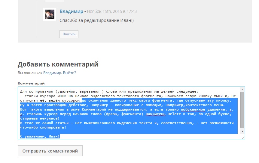 Для копирования (удаления, вырезания ) слова или предложения мы делаем следующее: — ставим курсора мыши на начало выделяемого текстового фрагмента, нажимаем левую кнопку мыши и, не отпуская её, ведём курсором до окончания данного текстового фрагмента, где отпускаем эту кнопку. Ну а затем производим действие, например — копирование с помощью, например,контекстного меню. Вот такого выделения в окне Комментарий не поддерживается, а есть только по буквенное удаление, т. е. ставишь курсор перед началом слова (фразы, фрагмента) нажимаешь Delete и так, по одной букве, стираешь ненужное! В теле же самой статьи — нет вышеописанного выделения текста и, соответственно, — нет возможности что-либо скопировать!