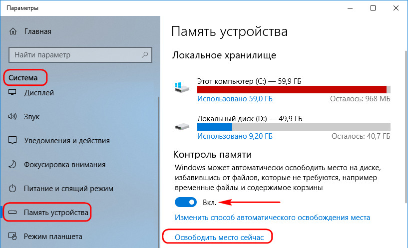 В Windows 10 очистку системы можно автоматизировать. Для этого в опции «Память» (-Параметры – Система – Память) устанавливаем переключатель функции контроля памяти в положение «Вкл.».