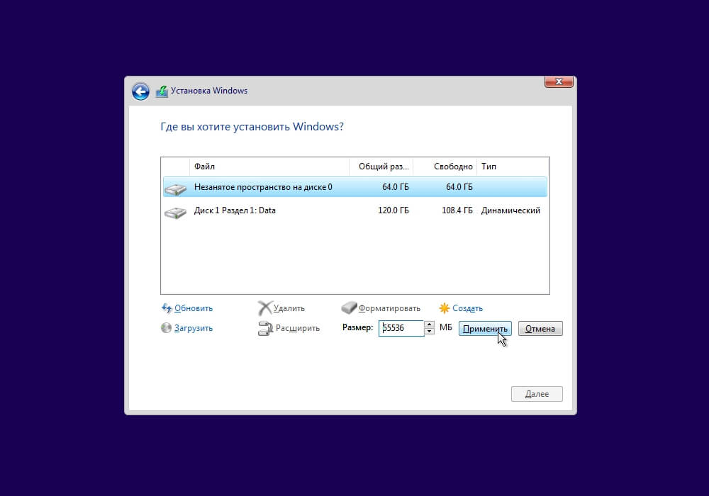 Выберите диск или раздел, который хотите отформатировать и установить на него ОС. Если ваш физический диск ещё не разбит на логические, предварительно нужно будет создать разделы или единственный раздел на весь диск. Выберите носитель, нажмите «Создать», укажите размер и нажмите «Применить».