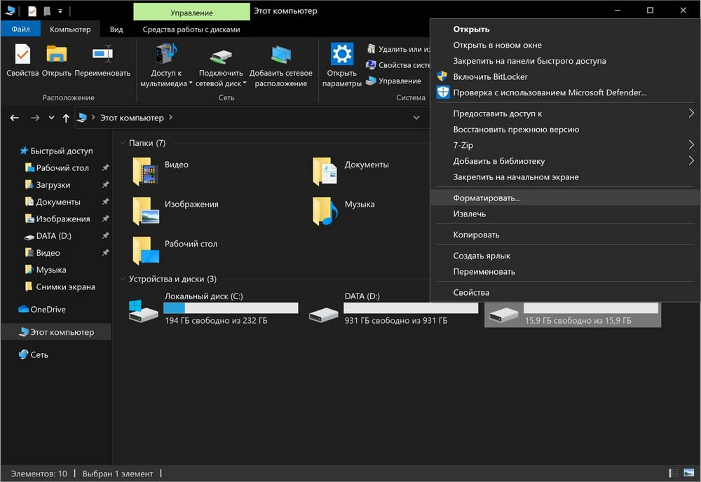Чтобы отформатировать диск при помощи встроенной графической оболочки, запустите «Проводник» Windows и выберите в колонке слева пункт «Этот компьютер» («Компьютер» в более ранних версиях ОС).