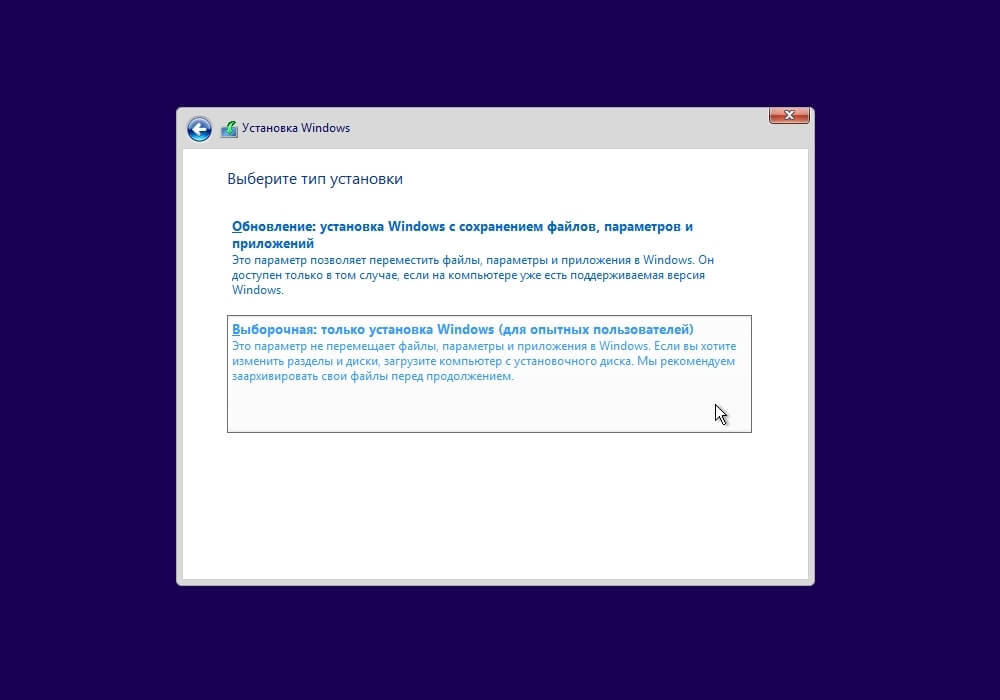 На этапе выбора типа установки кликните по пункту «Выборочная: только установка Windows».
